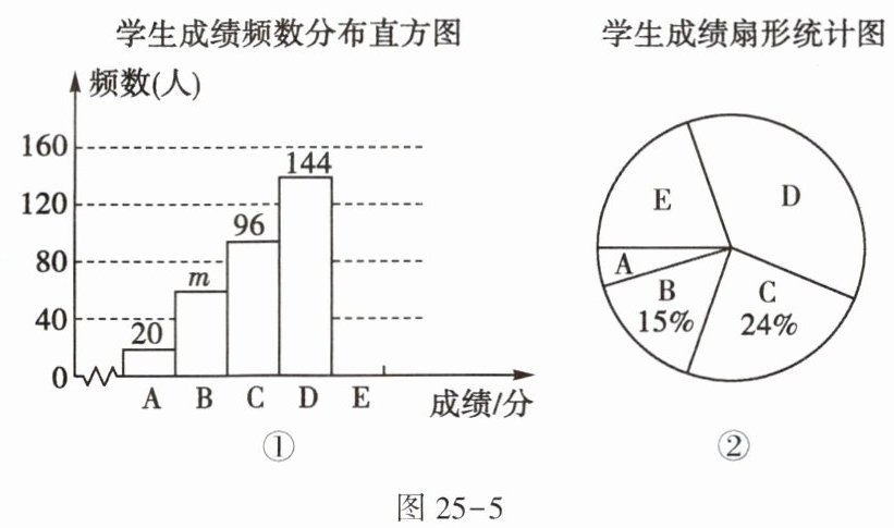补全学生成绩频数分布直方图:在E组对应位置画高度为80的条形。