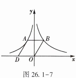 15. (★★)(2022·龙东)如图 26.1 - 7,在平面直角坐标系中,点 $ O $ 为坐标原点,平行四边形 $ OBAD $ 的顶点 $ B $ 在反比例函数 $ y = \frac{3}{x} $ 的图象上,顶点 $ A $ 在反比例函数 $ y = \frac{k}{x} $ 的图象上,顶点 $ D $ 在 $ x $ 轴的负半轴上.若平行四边形 $ OBAD $ 的面积是 5,则 $ k $ 的值是【
