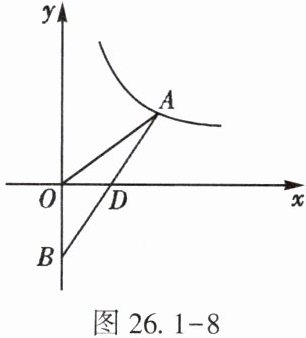 16. (★★)(2022·锦州)如图 26.1 - 8,在平面直角坐标系中, $ \triangle AOB $ 的边 $ OB $ 在 $ y $ 轴上,边 $ AB $ 与 $ x $ 轴交于点 $ D $,且 $ BD = AD $,反比例函数 $ y = \frac{k}{x}(x > 0) $ 的图象经过点 $ A $,若 $ S_{\triangle OAB} = 1 $,则 $ k $ 的值为