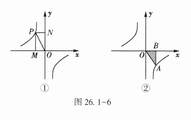 14. (★★)阅读材料:反比例函数 $ y = \frac{k}{x}(k \neq 0) $ 的本质特征是两个变量 $ x $ 与 $ y $ 的积是一个常数 $ k $,即 $ xy = k(k \neq 0) $.由此,不难得出比例系数 $ k $ 的几何意义:如图 26.1 - 6①,过双曲线 $ y = \frac{k}{x}(k \neq 0) $ 上任意一点 $ P(x, y) $ 作 $ PM \perp x $ 轴于点 $ M $、$ PN \perp y $ 轴于点 $ N $,则有 $ PM = |y| $, $ PN = |x| $,所以 $ S_{矩形PMON} = |xy| = |k| $, $ S_{\triangle POM} = S_{\triangle PON} = \frac{1}{2}|k| $.利用材料中的信息,可以解决许多与图形面积有关的问题.