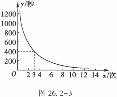 11. (★★) 小明同学训练某种运算技能,每次训练完成相同数量的题目,每次训练题目难度相当。当训练次数不超过 15 次时,完成一次训练所需要的时间 $ y $ (单位:秒) 与训练次数 $ x $ (单位:次) 之间满足如图 26.2 - 3 所示的反比例函数关系。完成第 3 次训练所需时间为 400 秒。