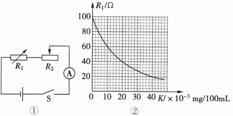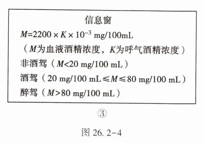 13. (★★) (2022·河南) 呼气式酒精测试仪中装有酒精气体传感器,可用于检测驾驶员是否酒后驾车。酒精气体传感器是一种气敏电阻 (图 26.2 - 4① 中的 $ R_1 $),$ R_1 $ 的阻值随呼气酒精浓度 $ K $ 的变化而变化 (如图 26.2 - 4②),血液酒精浓度 $ M $ 与呼气酒精浓度 $ K $ 的关系见图 26.2 - 4③。下列说法不正确的是 【
