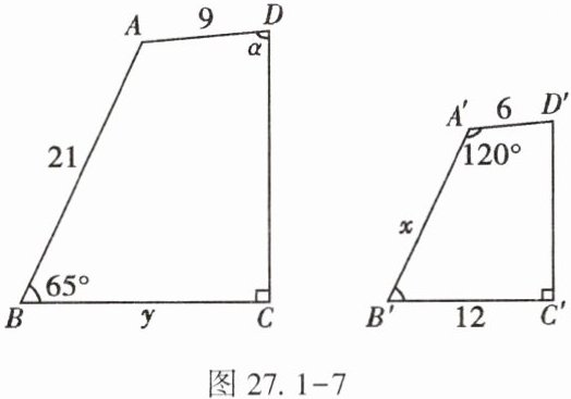 11. (★★)如图27.1 - 7,四边形$ABCD与四边形A'B'C'D'$是相似的,且$D'C'\perp B'C'$,根据图中的条件,求出未知的边$x$,$y及角\alpha$。