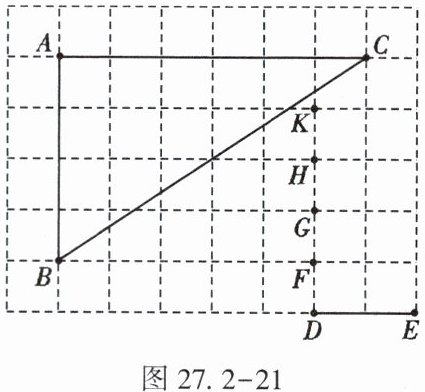9. (★)如图27.2 - 21,点$A$,$B$,$C$,$D$,$E$,$F$,$G$,$H$,$K都是6×8$方格纸中的格点,为使$\triangle DEM\backsim\triangle ABC$,则点$M应是F$,$G$,$H$,$K$四点中的【