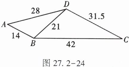 13. (★★)如图27.2 - 24,某地四个乡镇$A$,$B$,$C$,$D$之间建有公路,已知$AB = 14\mathrm{km}$,$AD = 28\mathrm{km}$,$BD = 21\mathrm{km}$,$BC = 42\mathrm{km}$,$DC = 31.5\mathrm{km}$. 公路$AB与DC$平行吗? 说明理由.