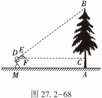 5. (★★)如图27.2-68,小明用自制的直角三角形纸板DEF测量树的高度AB.他调整自己的位置,设法使斜边DF保持水平,并且边DE与点B在同一直线上,已知纸板的两条直角边DE= 40cm,EF= 30cm,测得边DF离地面的高度AC= 1.5m,CD= 10m,则树高AB是