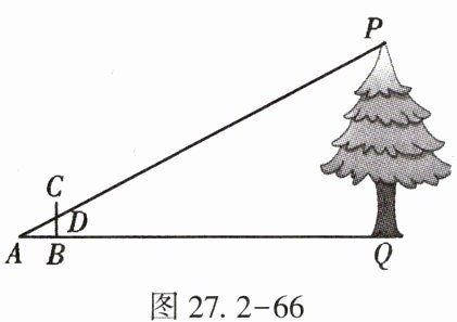 3. (★)(2023·江西)《周髀算经》中记载了“偃矩以望高”的方法.“矩”在古代指两条边呈直角的曲尺(即图27.2-66中的ABC).“偃矩以望高”的意思是把“矩”仰立放,可测量物体的高度.如图,点A,B,Q在同一水平线上,∠ABC和∠AQP均为直角,AP与BC相交于点D.测得AB= 40cm,BD= 20cm,AQ= 12m,则树高PQ=