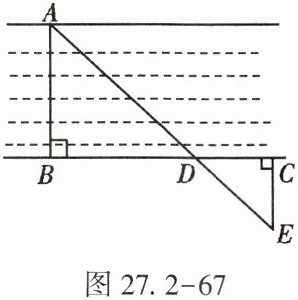 4. (★)如图27.2-67,一个兴趣小组到达某河岸,只用简单的工具就可以很快计算出河的宽度,在河对岸选定一个目标作为点A,再在河的这一岸上选点B和点C,使AB⊥BC,然后选点E,使EC⊥BC,BC和AE的交点为D,此时如果测得BD= 120m,DC= 60m,EC= 50m,就能算出两岸间的大致距离AB=