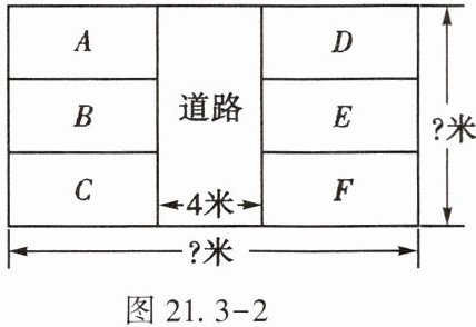 5. (★★)学校体育组准备在操场上规划出一块长方形区域开展跳绳比赛,比赛区域包括六块相同的跳绳场地及预留道路,图 21.3 - 2 是比赛区域的规划图,现知道每块跳绳场地的长是宽的两倍(场地间空隙忽略不计),预留道路的宽度为 4 米,比赛区域的总面积为 144 平方米。请你根据以上信息,求比赛区域的长和宽分别是多少米。