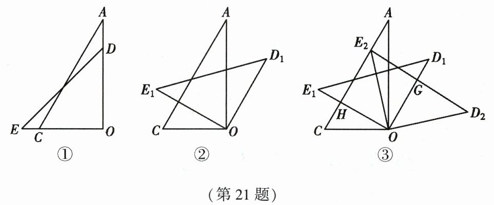 21. (10 分)将一副直角三角板$DOE与AOC$叠放在一起,如图①,$\angle O = 90^{\circ}$,$\angle A = 30^{\circ}$,$\angle E = 45^{\circ}$,$OD>OC$. 在两三角板所在平面内,将三角板$DOE绕点O顺时针方向旋转\alpha(0^{\circ} < \alpha < 90^{\circ})到D_1OE_1$位置,使$OD_1// AC$,如图②.