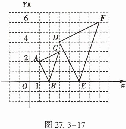 6. (★★)(2023·遂宁)在方格图中,以格点为顶点的三角形叫格点三角形. 在如图 27.3 - 17 所示的平面直角坐标系中,格点$\triangle ABC与\triangle DEF$成位似关系,则位似中心的坐标为【