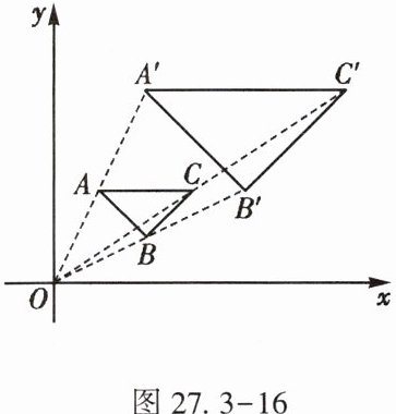 5. (★)(2023·浙江)如图 27.3 - 16,在平面直角坐标系中,$\triangle ABC的三个顶点分别为A(1,2)$,$B(2,1)$,$C(3,2)$,现以原点$O$为位似中心,在第一象限内作与$\triangle ABC的位似比为2的位似图形\triangle A'B'C'$,则顶点$C'$的坐标是【