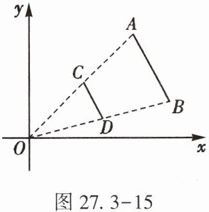 4. (★)如图 27.3 - 15,线段$AB两个端点的坐标分别为A(6,6)$,$B(8,2)$,以原点$O$为位似中心,在第一象限内将线段$AB缩小为原来的\frac{1}{2}后得到线段CD$,则端点$C$的坐标为【