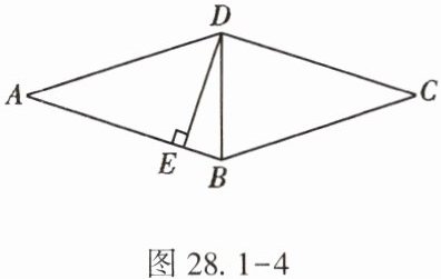 14. (★★) 如图 28.1 - 4,菱形 $ ABCD $ 的周长为 $ 40 cm $,$ DE \perp AB $,垂足为 $ E $,$ \sin A = \frac{3}{5} $。有下列结论:① $ DE = 6 cm $;② $ BE = 2 cm $;③ 菱形的面积为 $ 60 cm^2 $;④ $ BD = 4\sqrt{10} cm $。其中正确的有【