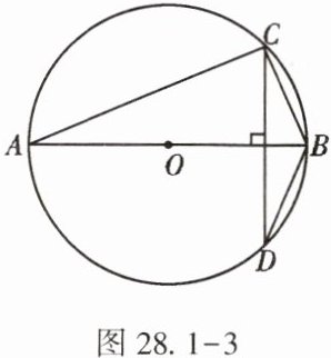 13. (★★) 如图 28.1 - 3,已知 $ AB $ 是 $ \odot O $ 的直径,弦 $ CD \perp AB $,$ AC = 2\sqrt{2} $,$ BC = 1 $,那么 $ \sin \angle ABD $ 的值是