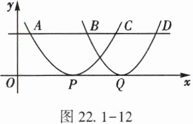 17. (★★★) (2023·台湾) 平面坐标上有两个二次函数的图形,它们的顶点 $ P $,$ Q $ 都在 $ x $ 轴上,且有一水平线与两图形相交于 $ A $,$ B $,$ C $,$ D $ 四点,各点位置如图 22.1 - 12 所示,若 $ AB = 10 $,$ BC = 5 $,$ CD = 6 $,则 $ PQ $ 的长度为【