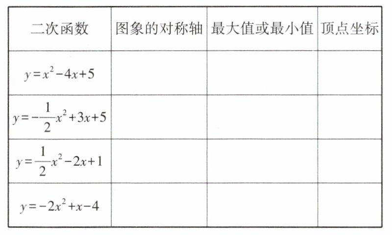 | $ y = \frac{1}{2}x^{2} - 2x + 1 $|$x=2$|最小值$-1$|$(2,-1)$|