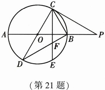 21. (10 分)如图,$ AB $,$ CD $ 为 $ \odot O $ 的直径,过点 $ C $ 的切线与 $ AB $ 的延长线交于点 $ P $,$ \angle ABC = 2\angle BCP $,$ E $ 是 $ \overset{\frown}{BD} $ 的中点,弦 $ CE $,$ BD $ 相交于点 $ F $。
