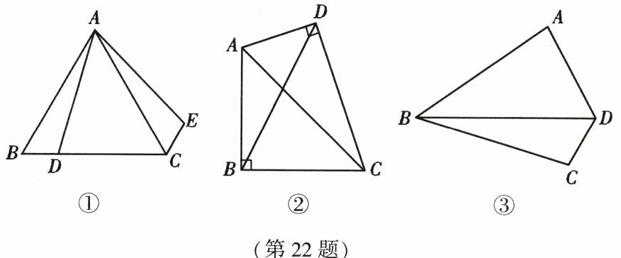 (1)如图①,$ \triangle ABC $ 是等边三角形,在 $ BC $ 上任取一点 $ D $($ B $,$ C $ 除外),连接 $ AD $,我们把 $ \triangle ABD $ 绕点 $ A $ 逆时针旋转 $ 60^{\circ} $,则 $ AB $ 与 $ AC $ 重合,点 $ D $ 的对应点为 $ E $。请根据给出的定义判断,四边形 $ ADCE $______