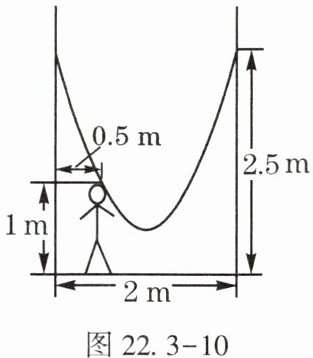 3. ($★$)如图22.3 - 10,小明的父亲在相距$2m$的两棵树间拴了一根绳子,给小明做了一个简易的秋千。拴绳子的地方距地面高都是$2.5m$,绳子自然下垂呈抛物线状,身高$1m$的小明距较近的那棵树$0.5m$时,头部刚好接触到绳子,则绳子的最低点距地面的距离为