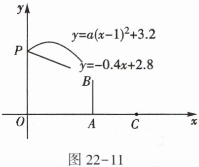 如图 22 - 11,在平面直角坐标系中,点 $ A $,$ C $ 在 $ x $ 轴上,球网 $ AB $ 与 $ y $ 轴的水平距离 $ OA = 3 $ m,$ CA = 2 $ m,击球点 $ P $ 在 $ y $ 轴上。若选择扣球,羽毛球的飞行高度 $ y $ (m) 与水平距离 $ x $ (m) 近似满足一次函数关系式 $ y = -0.4x + 2.8 $;若选择吊球,羽毛球的飞行高度 $ y $ (m) 与水平距离 $ x $ (m) 近似满足二次函数关系式 $ y = a(x - 1)^2 + 3.2 $。