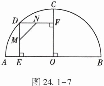 15. (★★)如图 24.1 - 7,$AB$为半圆的直径,$O$为圆心,$OC\perp AB交半圆于点C$,$D$是半圆上的动点(不与点$A$,$B$,$C$重合),点$D从点A出发向点B$运动. 过点$D作DE\perp AB$,$DF\perp OC$,垂足分别为$E$,$F$,分别取$DE和DF的中点M$,$N$,连接$MN$. 若$AB = 10$,则下列关于$MN$的说法正确的是【