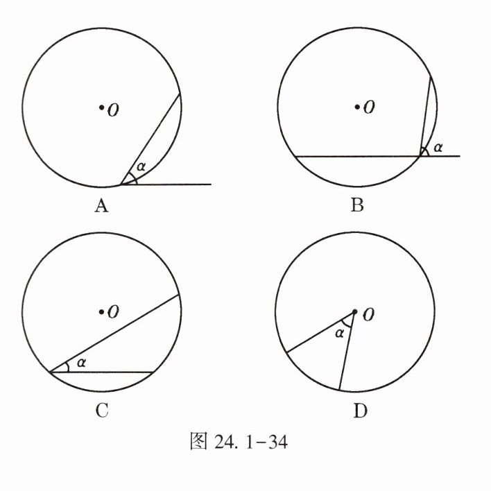 3. (★)如图 24.1-34,下列选项中,$\angle\alpha$为圆周角的是【