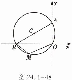 18. (★★)如图 24.1-48,$\odot C$过原点,且与两坐标轴分别交于点$A,B$,点$A的坐标为(0,4)$,$M是第三象限内\overset{\LARGE{\frown}}{OB}$上一点,$\angle BMO = 120^{\circ}$.