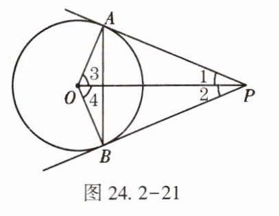 *6. (★)如图 24.2 - 21,PA,PB为⊙O的切线,A,B为切点,有以下结论:①PA = PB;②∠1 = ∠2;③∠3 = ∠4;④AB垂直平分OP;⑤AB被OP垂直平分.其中正确的结论有【