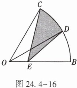 20. (★★)(河南)如图 24.4 - 16,在扇形 $ BOC $ 中,$ \angle BOC = 60^{\circ} $,$ OD $ 平分 $ \angle BOC $ 交 $ \overset{\frown}{BC} $ 于点 $ D $,点 $ E $ 为半径 $ OB $ 上一动点。若 $ OB = 2 $,则阴影部分周长的最小值为