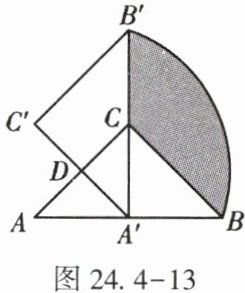 17. (★★)如图 24.4 - 13,在 $ \triangle ABC $ 中,$ \angle ACB = 90^{\circ} $,$ AC = BC = 2 $,将 $ \triangle ABC $ 绕 $ AC $ 的中点 $ D $ 逆时针旋转 $ 90^{\circ} $ 得到 $ \triangle A'B'C' $,其中点 $ B $ 的运动路径为 $ \overset{\frown}{BB'} $,则图中阴影部分的面积为