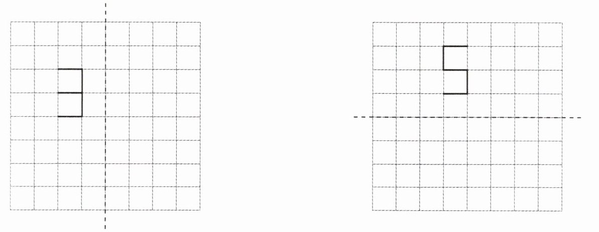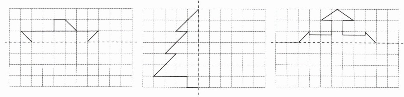 2. 以虚线为对称轴,在方格纸上画出下面图形的轴对称图形。