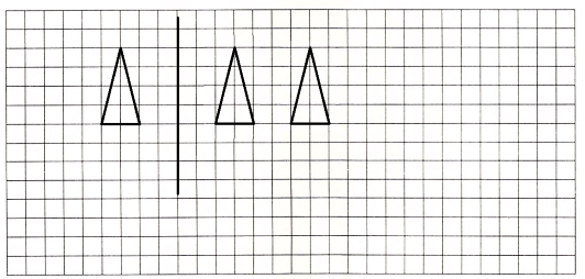 请你在下面的方格纸上画一个自己喜欢的图形,并画出它的轴对称图形,再画出将这个轴对称图形向右平移4格后的图形。