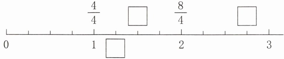 【解析】:观察数轴,0到1、1到2、2到3均被平均分成4份,每份为$\frac{1}{4}$。上面第一个□在1右侧1格,为$\frac{4}{4}+\frac{1}{4}=\frac{5}{4}$;上面第二个□在2右侧2格,为$\frac{8}{4}+\frac{2}{4}=\frac{10}{4}$。下面□在1右侧1格,为$1+\frac{1}{4}=1\frac{1}{4}$。