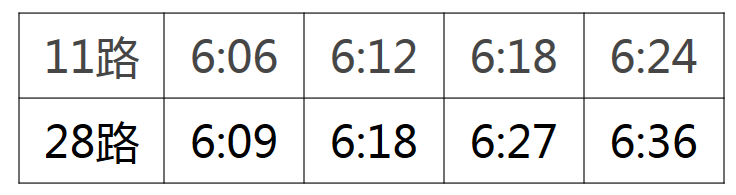 3. 11路和28路公共汽车早上6时同时从始发站发车。11路车每隔6分发一班,28路车每隔9分发一班,这两路车几时再次同时发车?请列表解答。