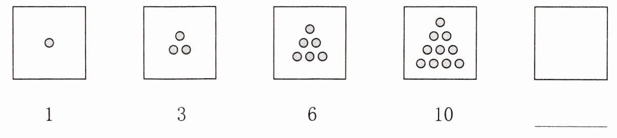 最后一个方框应画15个○(自然数前5个数的和,$\frac{5×(5 + 1)}{2}=15,$画1个○在第1行,2个○在第2行,3个○在第3行,4个○在第4行,5个○在第5行)