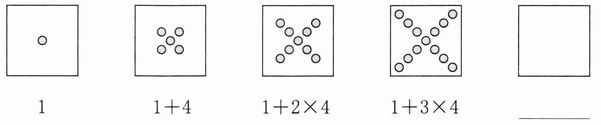 最后一个方框应画:1+4×(5 - 1)+4 = 1+20 + 4=25(个○,即画5×5的点子图,横向和纵向都是5个○)