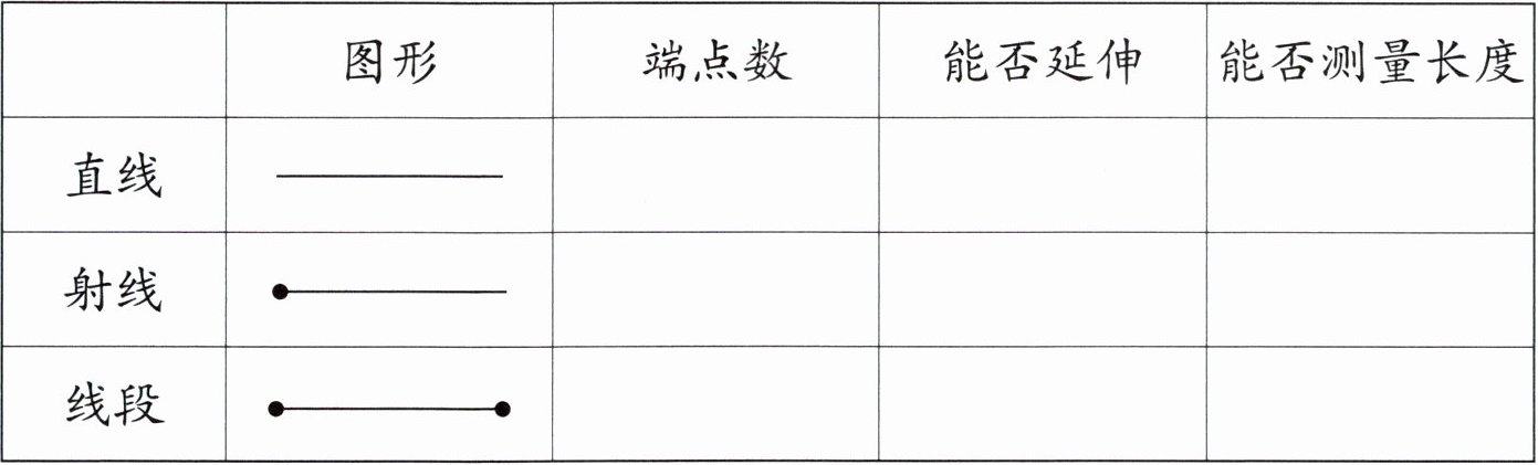线段:端点数 2,能否延伸 否,能否测量长度 是
