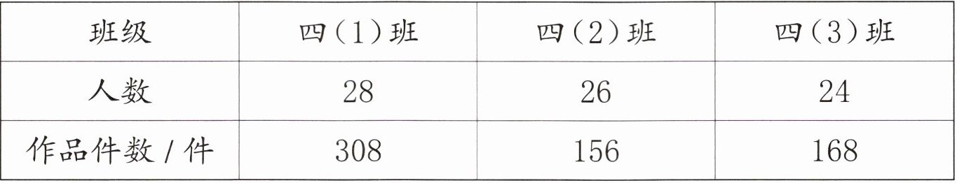 三、希望小学四年级三个班的同学在艺术节制作的手工作品情况如下表。