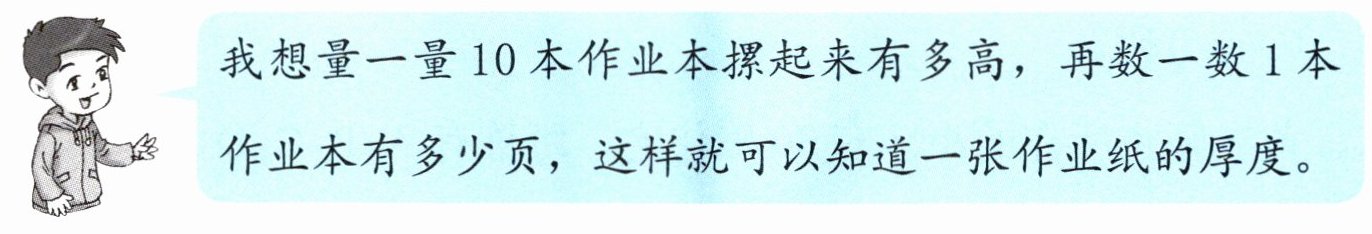 我想量一量 10 本作业本摞起来有多高,再数一数 1 本作业本有多少页,这样就可以知道一张作业纸的厚度。