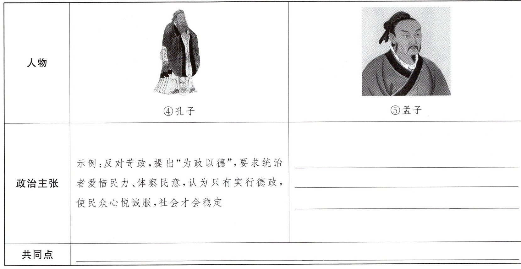 (2)仿照示例,写出图⑤人物的政治主张,并概述二者思想的共同点。(4分)