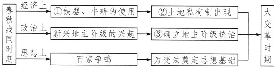 (1)联系:铁器、牛耕的使用促进了生产力的发展,导致土地私有制出现,新兴地主阶级兴起,新兴地主阶级为了确立自己的统治地位,纷纷进行变法,最终确立了地主阶级统治。(3分)趋势:从奴隶社会向封建社会过渡;国家趋向统一。(答出一点即可,1分)