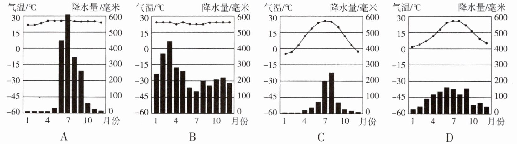 10. 某地区夏季高温多雨,冬季寒冷少雨,四季分明,下列图中符合这一气候特征的是(