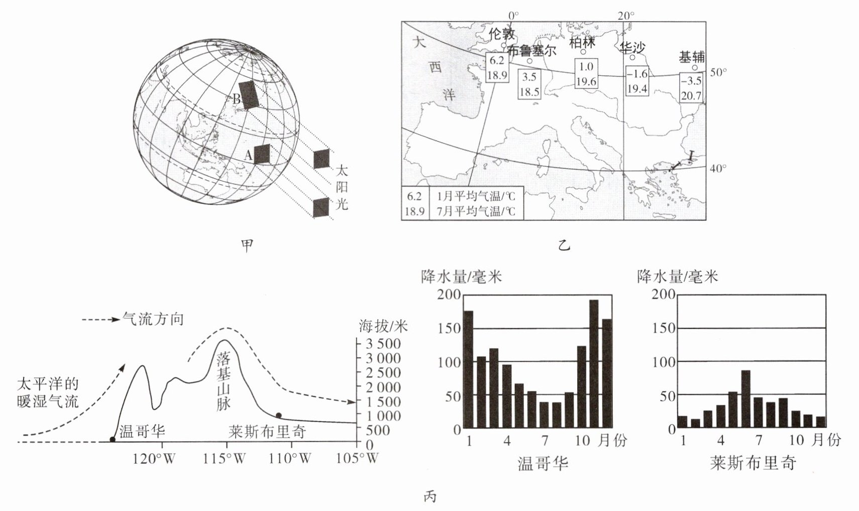 某学校地理学习小组搜集了三幅图来探究影响气候的部分因素,其中图甲是同等太阳光束照射到地球表面的示意图,图乙是欧洲同纬度地带5个城市的气温示意图,图丙是落基山脉两侧城市海拔及逐月降水量图。请你一起来完成下列探究。