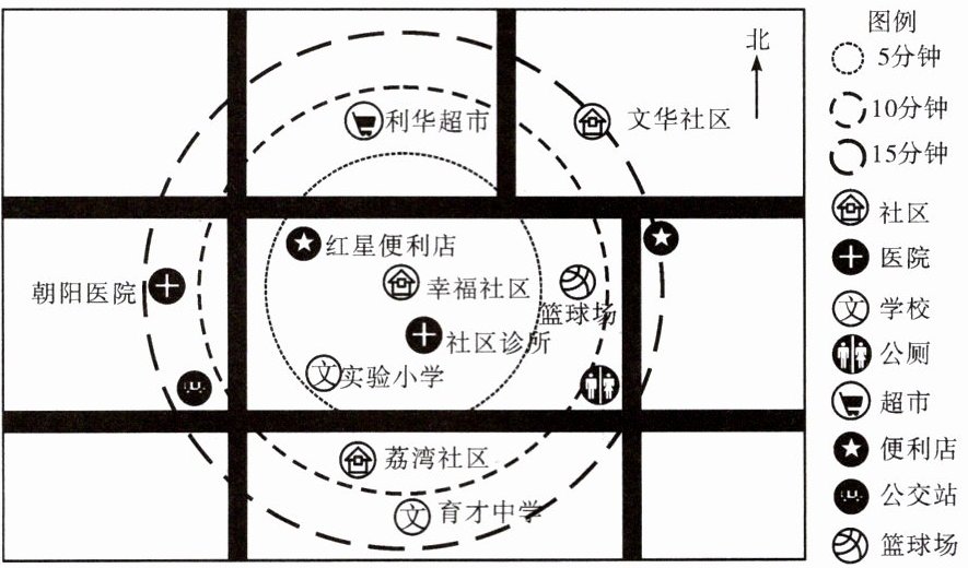 “15分钟便民生活圈”是以社区为中心,市民步行直线距离仅需15分钟即可享受购物、社交、文化、休闲、医疗、健身、教育等多种便民服务。读幸福社区“15分钟便民生活圈”示意图,完成13~15题。