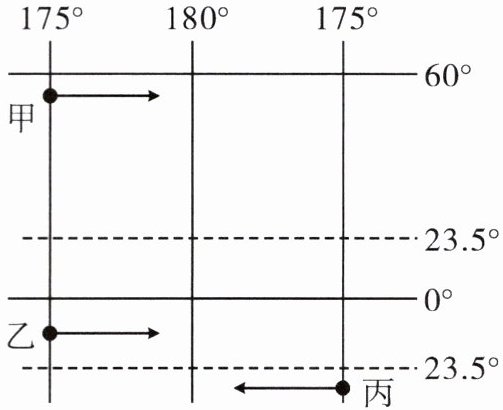 10. 甲、乙、丙三艘轮船从所在海域同时沿下图所示方向驶向$180^{\circ}$经线,若时速相同,下列叙述正确的是(