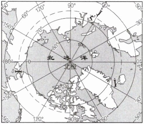读北极地区示意图,完成 7~8 题。