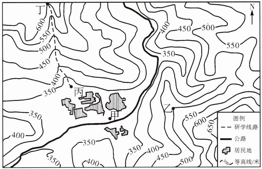 3. 研学路线上丙地与丁地的相对高度可能是(