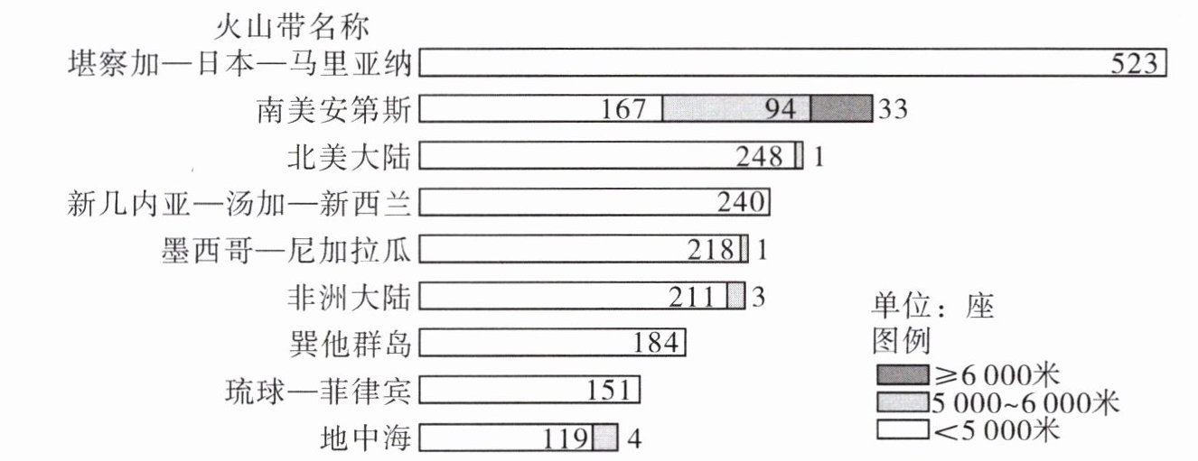 读世界主要火山带不同海拔火山数量统计图,完成 $ 19 \sim 20 $ 题。