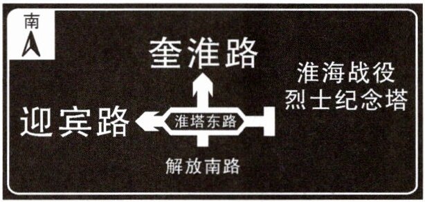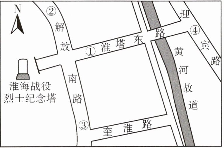 某中学学生步行前往淮海战役烈士纪念塔参加清明祭扫活动。读该学生途中迎面看到的道路指示牌示意图和淮海战役烈士纪念塔位置示意图,完成 5~6 题。